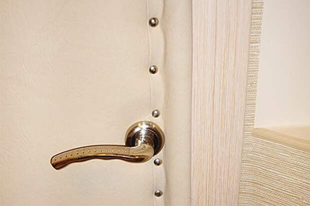 Дверь обязательно снимают с петель и выкладывают на горизонтальную поверхность. Можно воспользоваться клеевым методом с использованием винтовых пуговиц, если дверь филенчатая или металлическая, или обивочными гвоздями с широкими шляпками, если дверь из массива дерева.